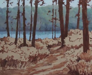 Working from back to front and top to bottom, I painted the sky, the far trees, and the water. I used cool colors introducing some pinks here and there for the atmospheric perspective.