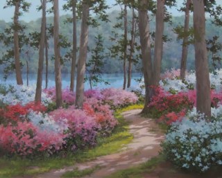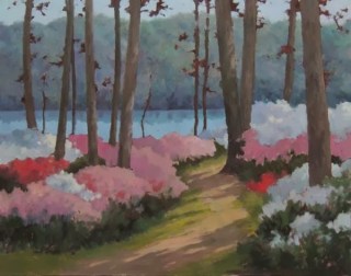 These are three of the photos I took that day. You can see how I took liberties with the scene, especially showing more of the water than I could really see. I also accentuated the light on the path and the way it turned behind the azalea bushes.