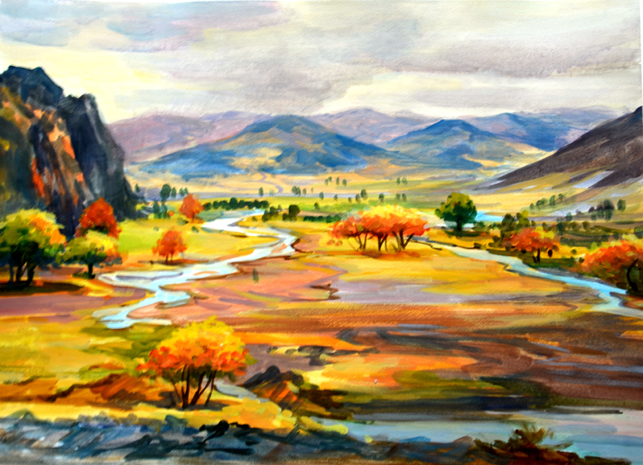 The beautiful scenery drawn by a painter is the inflection of the beautiful soul. Since my childhood, I have liked landscape painting. Soaring peaks, bold deserts, towering poplars, and nameless flowers in painting are the symbols of pure nature and songs of praise to life. Mountains in my paintings exhibit strength, trees show flourishing life, and rivers reveal an unremitting pursuit of nature.
