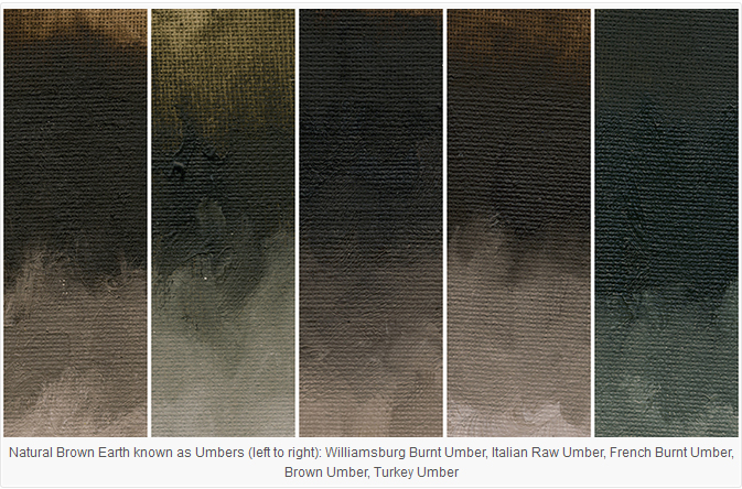 In terms of composition, Umbers contain oxides and hydroxides of iron and manganese; the manganese, in particular, separating them from other iron oxides like the Ochres and Siennas. Umbers tend to be quite variable in the exact proportions of iron to manganese, which gives rise to all the subtle differences in color and behavior that artists prize and seek. While on a microscopic level the two types of Umbers might be similar, the process of roasting, or calcining, the Raw Umber at very high temperatures in the presence of oxygen changes the iron hydroxides into iron oxides (iron III oxide). The result is a much warmer, reddish brown. Umbers are very permanent with excellent stability to light, moisture, and alkali and dilute acids, making them a good choice for exterior usage. In oil paints, the manganese content of Raw Umber has a siccative effect, making the Raw Umber an effective drier.