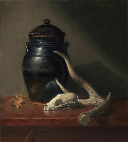 Third place was given to Texas painter Ann Kraft Walker for her outstanding “Fallen in the Woods.” This still life displays Walker’s talent for capturing the phenomenon of light, but more importantly, the differences in texture between natural and man-made objects. The viewer finds on a tabletop an animal skull, deer antler, ceramic jar, and a curled, brown leaf. Each object has been treated with the utmost attention. Noteworthy are the minute details of each, the subtle grooves of the antler, the hint of cracks in the skull, and the weathered edges of the black jar.