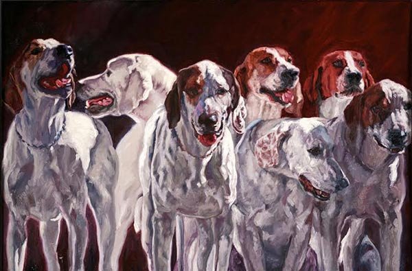 Over 700 entries are submitted each year to the competition, with only 110 accepted for the 2015 exhibition. Awards exceeded $17,000 in cash and sponsor certificates. Artist Linda Massey of Cottage Grove, Wisconsin, took home top honors with the Best of Show award for her “Magnificent Seven,” a beautiful study of individuality, companionship, and loyalty. Set in a dark crimson background, seven hounds are found in a variety of positions. From standing to sitting, each subject displays an individuality of pose and expression, creating a captivating rhythm and movement across the surface. While most of the dogs gaze into the distance outside the frame, the central subject faces and engages the viewer directly with a welcoming expression.