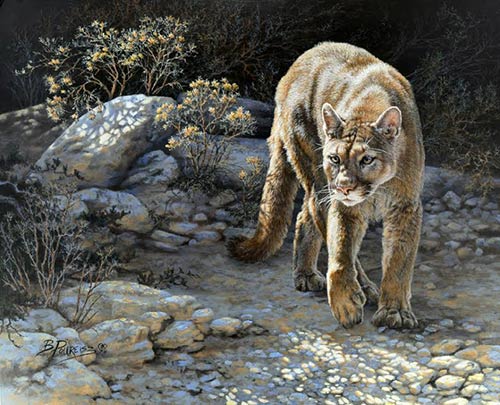 Missouri painter Brenda Pollreisz earned second place for her “Morning Patrol,” which displays a prowling mountain lion in search of its next meal. The palette is particularly outstanding in Pollreisz’s work with a patterned arrangement of complimentary blues and oranges composing the shadowed rocks. Set against the cool tones is the earthy hues from the sun-bathed coat of the big cat.