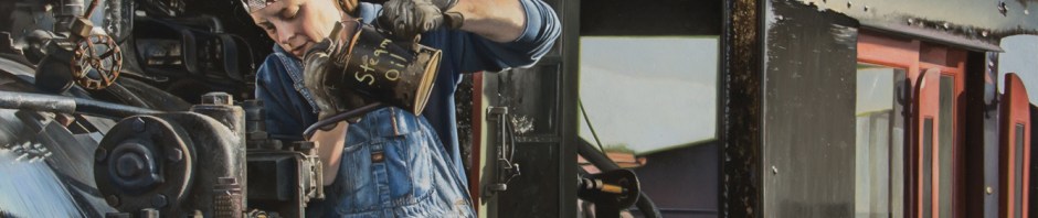 Lee Alban is a painter of stories. With his deft hand he creates a narrative that compels the viewer to look carefully into the painting, and work through the story. Lee devotes himself to his art full time, spending long hours in the studio creating his complicated compositions. He often works in a series, and the painting above is part of a collection called “Silk and Steel”, depicting “women who work on steam trains, but also includes women who build, maintain, and operate vintage steam tractors and other farm equipment.”