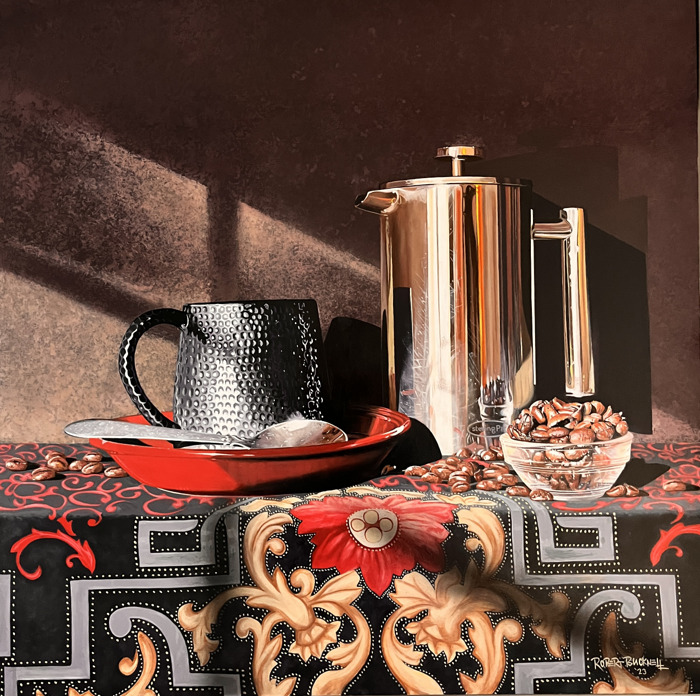 “Morning Coffee” 24×24, Oil on Panel by Robert Bucknell. Winner of BEST USE OF LIGHT AND COLOR