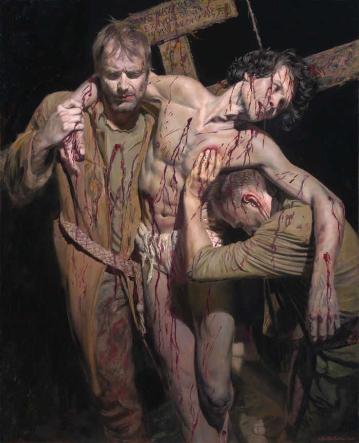 The contrast between the blood streaked, pale skin and the black background adds to the dramatic scene. I have seen this narrative before throughout art history but not like this. The limp body of Christ with his arms draped over the shoulders of the two lowering him from the cross is amazing. I can feel his weight due to the hand pressing into his chest and his armpit covering his head. No one is making eye contact, allowing the viewer to feel free to explore every inch of their bodies without confrontation. The composition looks like a figure 8, which reminds me of the symbol for infinity which further strengthens the narrative in a way I have
